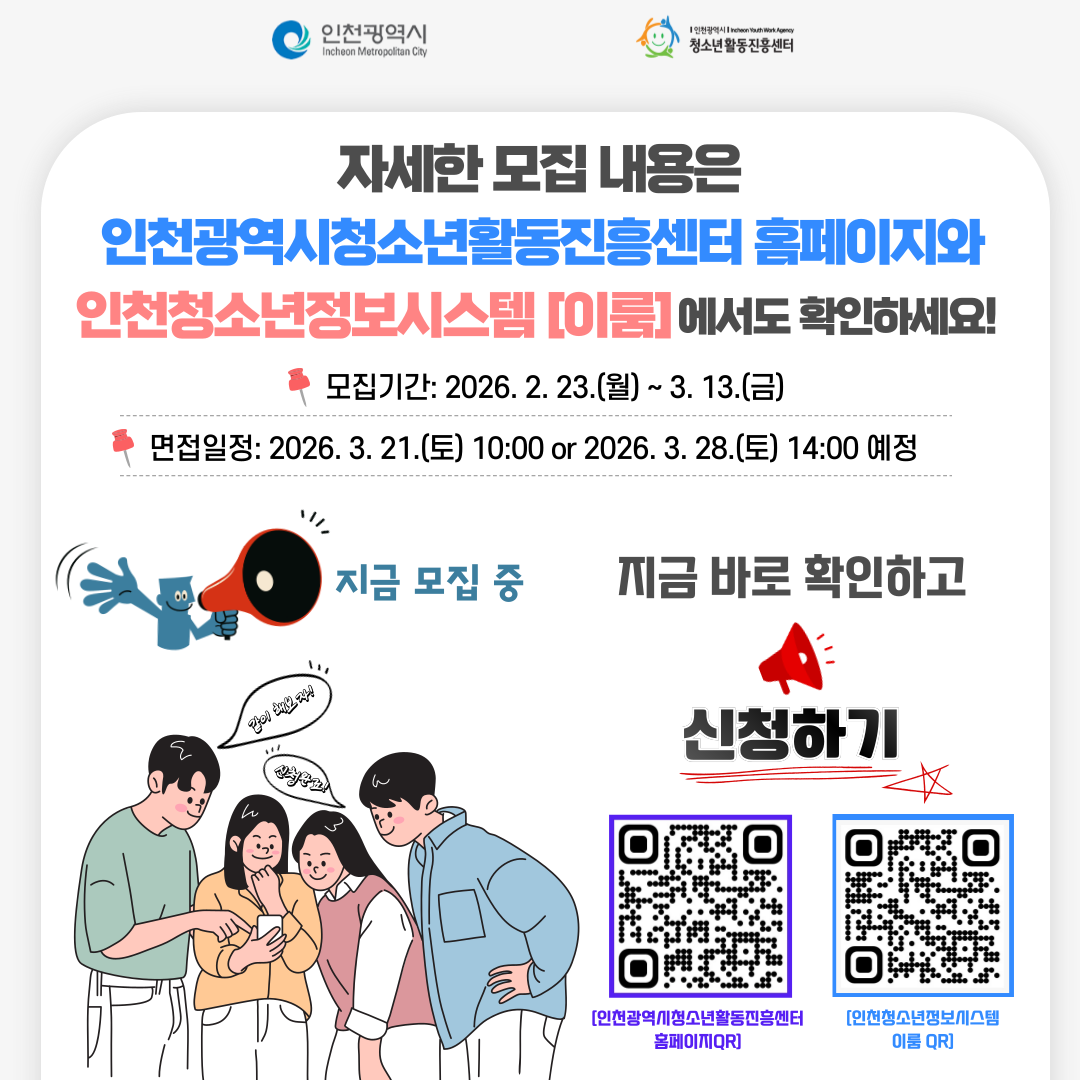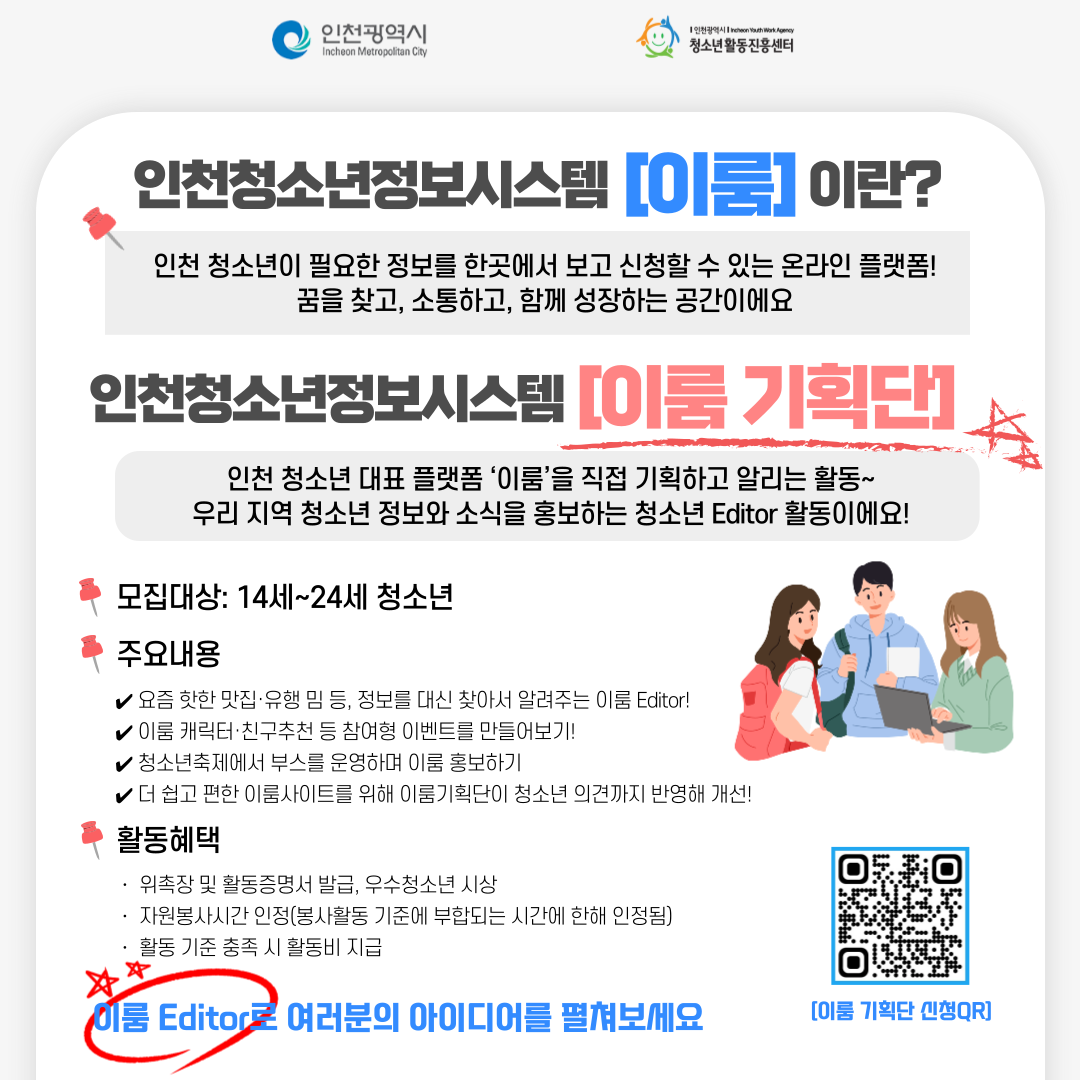 [인천광역시청소년활동진흥센터] 2026「인천청소년정보시스템 이룸 기획단(이룸 Editor)」모집 안내