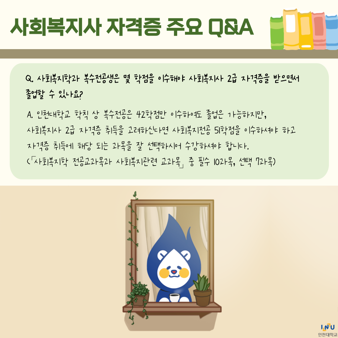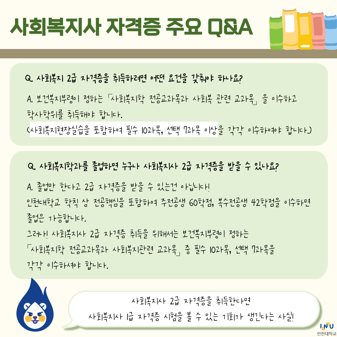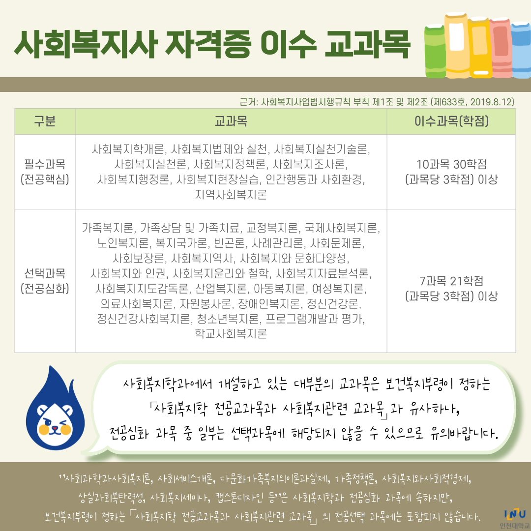 인천대학교 사회복지학과 졸업요건에 충족되어 졸업을 문제없이 하셨더라도, 한국사회복지사협회에서 정한 이수 과목 기준에 충족되지 않을 경우 자격증은 취득하실 수 없습니다.