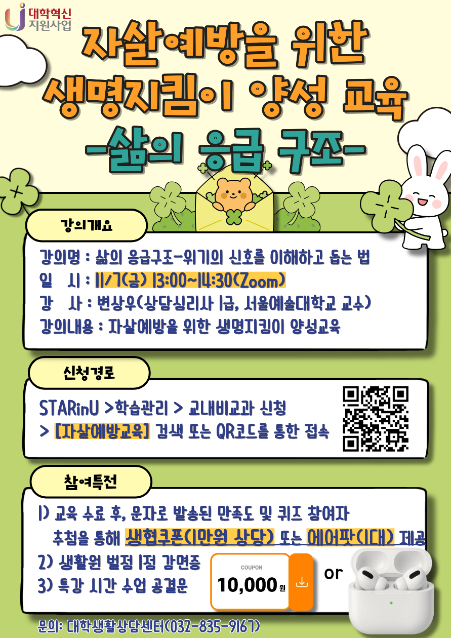 fnctId=bbs,fnctNo=748 [대학생활상담센터] 2025년 자살예방 교육 안내(삶의 응급구조 특강) 글번호 414640 작성일 2025-11-03 수정일 2025-11-03 작성자 사회복지학과 (032-835-8311) 조회수 36 첨부파일 첨부파일이(가) 없습니다. 다음글 이전글 [대학생활상담센터] 2025년도 2학기 미술치료 집단상담 참여 안내 이경선 2025-10-29 17:16:43.0 목록