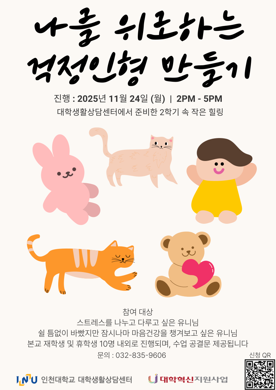 fnctId=bbs,fnctNo=748 [대학생활상담센터] 2025-2학기 나를 위로하는 걱정인형 만들기 집단상담 안내 글번호 415079 작성일 2025-11-14 수정일 2025-11-14 작성자 사회복지학과 (032-835-8311) 조회수 14 첨부파일 첨부파일이(가) 없습니다. 다음글 [취업역량개발과] 산업 및 직무이해 세미나 참여자 모집 안내 이경선 2025-11-14 11:04:34.0 이전글 [창업지원단] 제1회 유니컬쳐 아이디어 챌린지 모집 안내 이경선 2025-11-14 10:53:19.0 목록