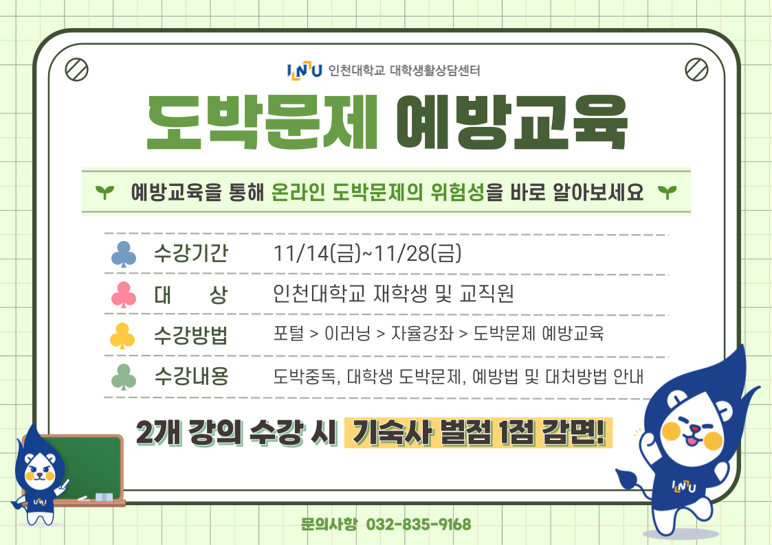 fnctId=bbs,fnctNo=748 [대학생활상담센터] 2025학년도 2학기 도박문제 예방교육 안내 글번호 415282 작성일 2025-11-18 수정일 2025-11-18 작성자 사회복지학과 (032-835-8311) 조회수 12 첨부파일 첨부파일이(가) 없습니다. 다음글 이전글 [학생지원과] 2026학년도 1학기 주거안정장학금(1차) 학생 신청기간 안내 이경선 2025-11-18 15:19:06.0 목록