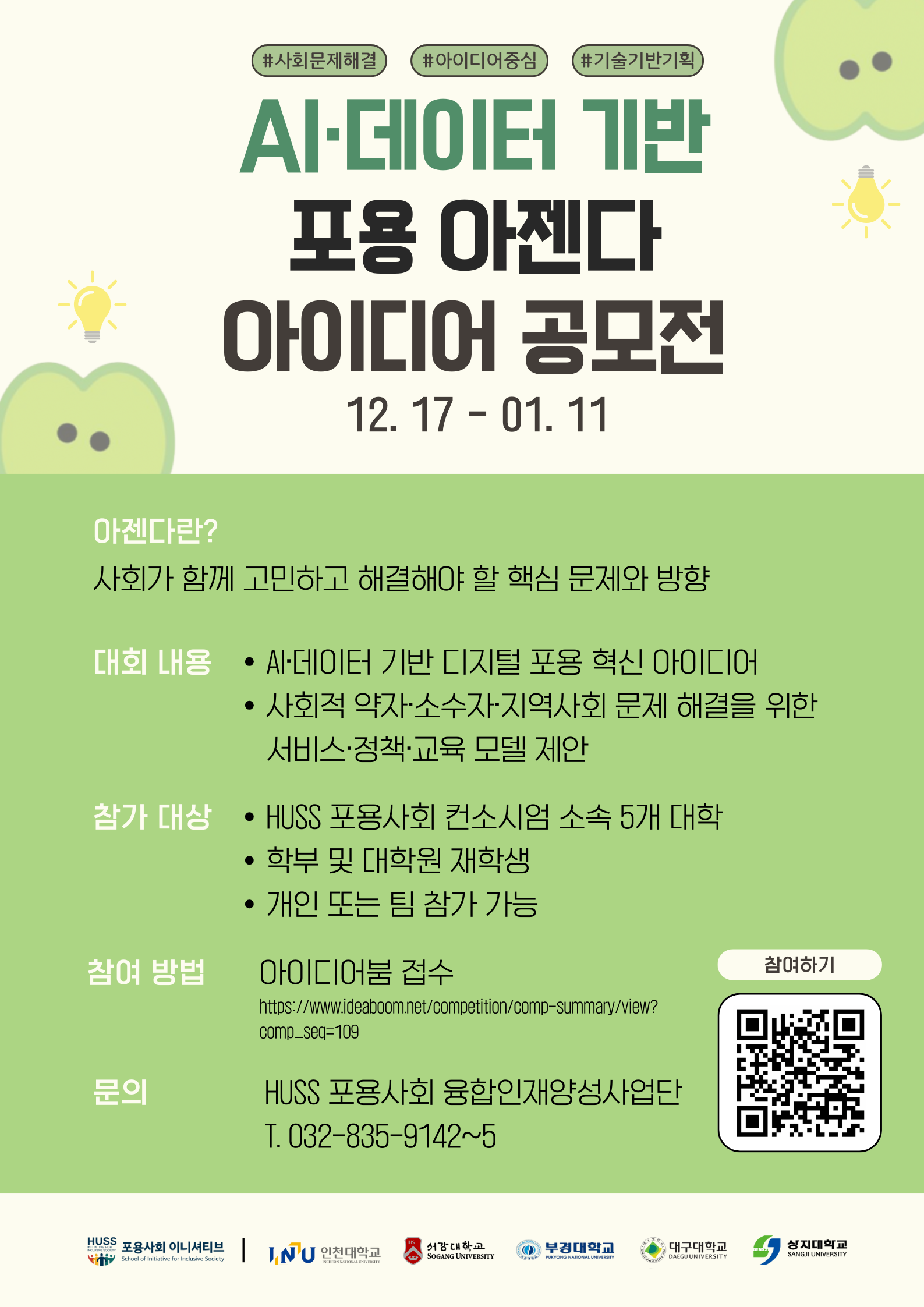 fnctId=bbs,fnctNo=748 [HUSS 포용사회사업단] AI*데이터 기반 포용 아젠다 아이디어 공모전 안내 글번호 416845 작성일 2025-12-24 수정일 2025-12-24 작성자 사회복지학과 (032-835-8311) 조회수 58 첨부파일 첨부파일이(가) 없습니다. 다음글 [융합자유전공대학] 2026학년도 1학기 학생설계융합전공 신청 안내 이경선 2025-12-24 16:36:15.0 이전글 [대학혁신사업] 대학혁신지원사업 학생 우수 참여 사례 공모전 안내 이경선 2025-12-23 12:17:24.0 목록