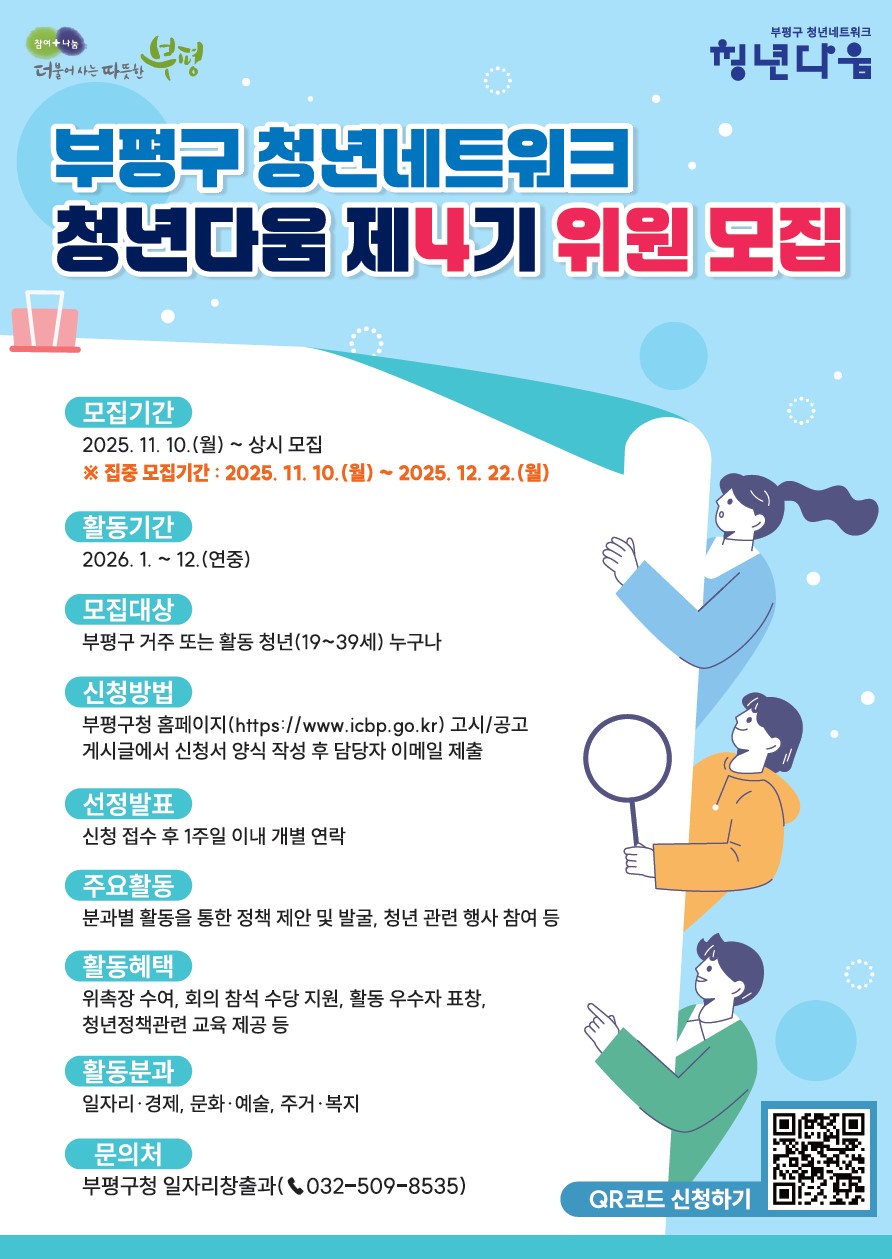 fnctId=bbs,fnctNo=747 [부평구 일자리창출과] 부평구 청년네트워크 청년다움 제4기 모집 안내 글번호 415080 작성일 2025-11-14 수정일 2025-11-14 작성자 사회복지학과 (032-835-8311) 조회수 10 첨부파일 첨부파일이(가) 없습니다. 다음글 이전글 [희망나래장애인복지관] 2026년 사회복지·직업재활 동계 실습생 모집 이경선 2025-11-05 13:30:45.0 목록