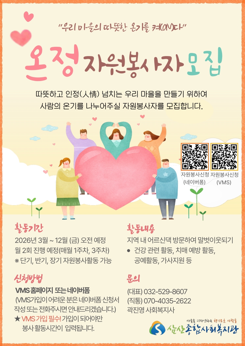 fnctId=bbs,fnctNo=747 [삼산종합사회복지관] 온정 자원봉사자 모집 안내 글번호 420078 작성일 2026-02-26 수정일 2026-02-26 작성자 사회복지학과 (032-835-8311) 조회수 15 첨부파일 첨부파일이(가) 없습니다. 다음글 이전글 [삼산종합사회복지관] 청년커뮤니티 주도 지역문제 해결 프로젝트 “슬기로운 청년생활” 26년 상반기 참여자 모집 안내 이경선 2026-02-26 17:26:08.0 목록
