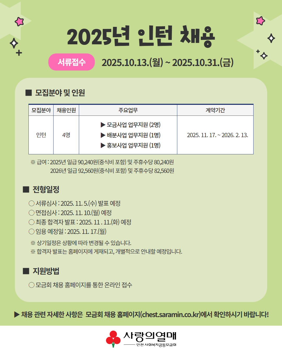 fnctId=bbs,fnctNo=745 [인천사회복지공동모금회] 2025년 인턴 채용 관련 공고 글번호 413653 작성일 2025-10-13 수정일 2025-10-13 작성자 사회복지학과 (032-835-8311) 조회수 254 링크 : https://chest.saramin.co.kr/redirect/recruit/apply_site.recruit.view/37351 첨부파일 첨부파일이(가) 없습니다. 다음글 이전글 [굿네이버스] 굿네이버스 인터내셔날 공개채용 안내 이경선 2025-10-01 14:58:11.0 목록